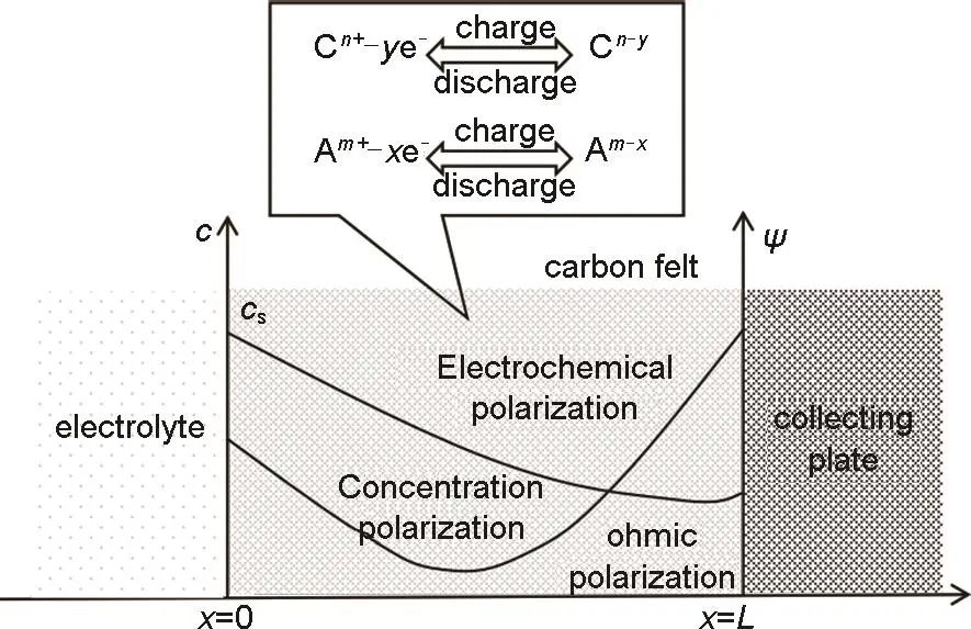 圖1 液流電池的極化示意圖,其中L表示碳?xì)趾穸?,c表示電解液濃度,cs為電解液在碳?xì)侄嗣嫔系臐舛?,ψl為液相電勢,ψs為固相電勢