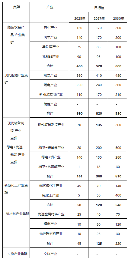 以習(xí)近平新時代中國特色社會主義思想為指導(dǎo),以鑄牢中華民族共同體意識為工作主線,錨定“闖新路、進(jìn)中游”目標(biāo),優(yōu)化調(diào)整產(chǎn)業(yè)布局,以新型工業(yè)化為核心,重點(diǎn)發(fā)展現(xiàn)代農(nóng)牧業(yè)、現(xiàn)代服務(wù)業(yè)和新興產(chǎn)業(yè),全力推動綠色農(nóng)畜產(chǎn)品、現(xiàn)代能源、現(xiàn)代裝備制造、綠電+先進(jìn)載能、新型化工、新材料、文旅“七大優(yōu)勢特色產(chǎn)業(yè)集群”建設(shè),加快構(gòu)建起多元發(fā)展、多極支撐的現(xiàn)代化產(chǎn)業(yè)體系。到2025年建成500億元以上產(chǎn)業(yè)集群1個、200億元以上產(chǎn)業(yè)集群2個、100億元以上產(chǎn)業(yè)集群3個;到2027年建成800億元以上產(chǎn)業(yè)集群1個、500億元以上產(chǎn)業(yè)集群2個、200億元以上產(chǎn)業(yè)集群3個、100億元以上產(chǎn)業(yè)集群6個;到2030年建成900億元以上產(chǎn)業(yè)集群1個、800億元以上產(chǎn)業(yè)集群2個、500億元以上產(chǎn)業(yè)集群4個、200億元以上產(chǎn)業(yè)集群6個。