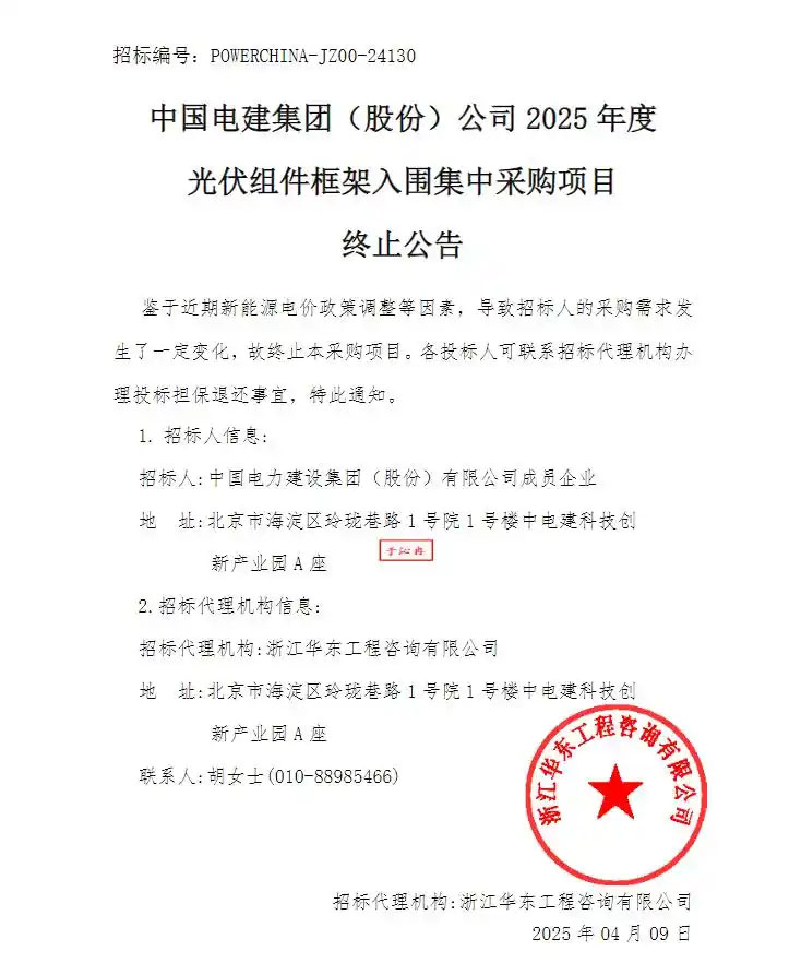 4月9日,中國(guó)電建設(shè)備物資集中采購(gòu)平臺(tái)公布的關(guān)于“中國(guó)電建集團(tuán)(股份)公司2025年度光伏組件框架入圍集中采購(gòu)項(xiàng)目終止公告”顯示,鑒于近期新能源電價(jià)政策調(diào)整等因素,導(dǎo)致招標(biāo)人[即中國(guó)電力建設(shè)集團(tuán)(股份)有限公司成員企業(yè)]的采購(gòu)需求發(fā)生了一定變化,故終止本采購(gòu)項(xiàng)目。落款為招標(biāo)代理機(jī)構(gòu)浙江華東工程咨詢有限公司。