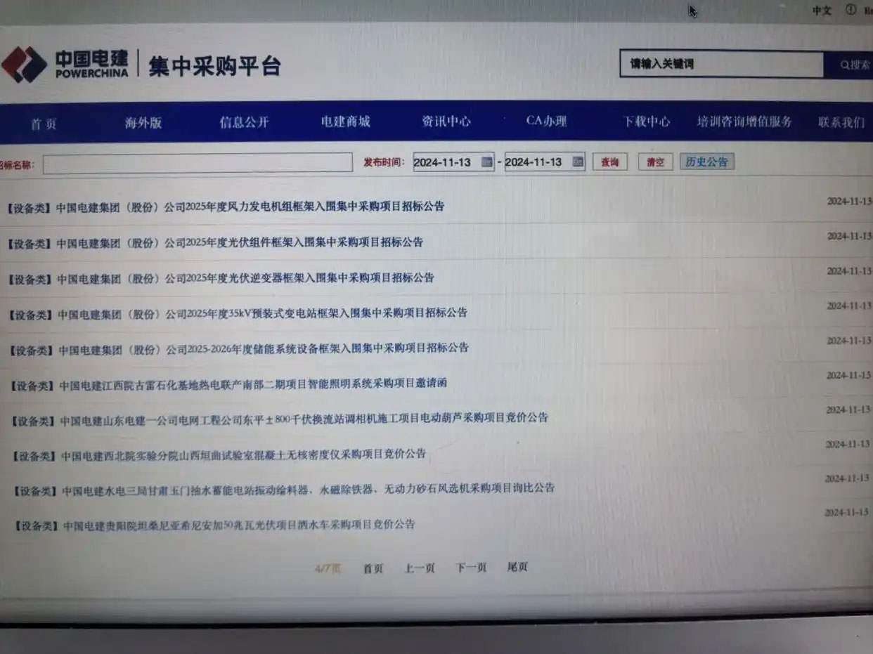 圖為中國(guó)電建設(shè)備物資集中采購(gòu)平臺(tái)發(fā)布的2025年度光伏組件框架入圍集中采購(gòu)項(xiàng)目招標(biāo)公告,以及風(fēng)電機(jī)組、光伏逆變器、儲(chǔ)能系統(tǒng)和變電站相關(guān)采購(gòu)招標(biāo)公告。