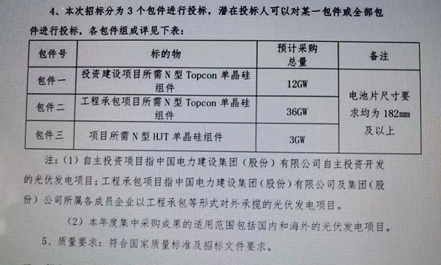 圖為中國(guó)電建設(shè)備物資集中采購(gòu)平臺(tái)發(fā)布的2025年度光伏組件框架入圍集中采購(gòu)項(xiàng)目招標(biāo)部分內(nèi)容。