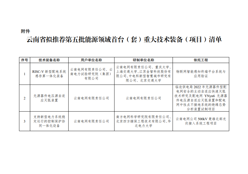根據(jù)《國家能源局綜合司關(guān)于組織開展第五批能源領(lǐng)域首臺(套)重大技術(shù)裝備申報工作的通知》和《能源領(lǐng)域首臺(套)重大技術(shù)裝備評定和評價辦法》(國能發(fā)科技〔2022〕81號)等有關(guān)要求,經(jīng)有關(guān)單位自愿申報、省能源局研究確定,擬將“RISC-V新型配電系統(tǒng)感存算一體化裝備”等12項技術(shù)裝備(項目)納入云南省推薦清單(見附件),現(xiàn)予公示。