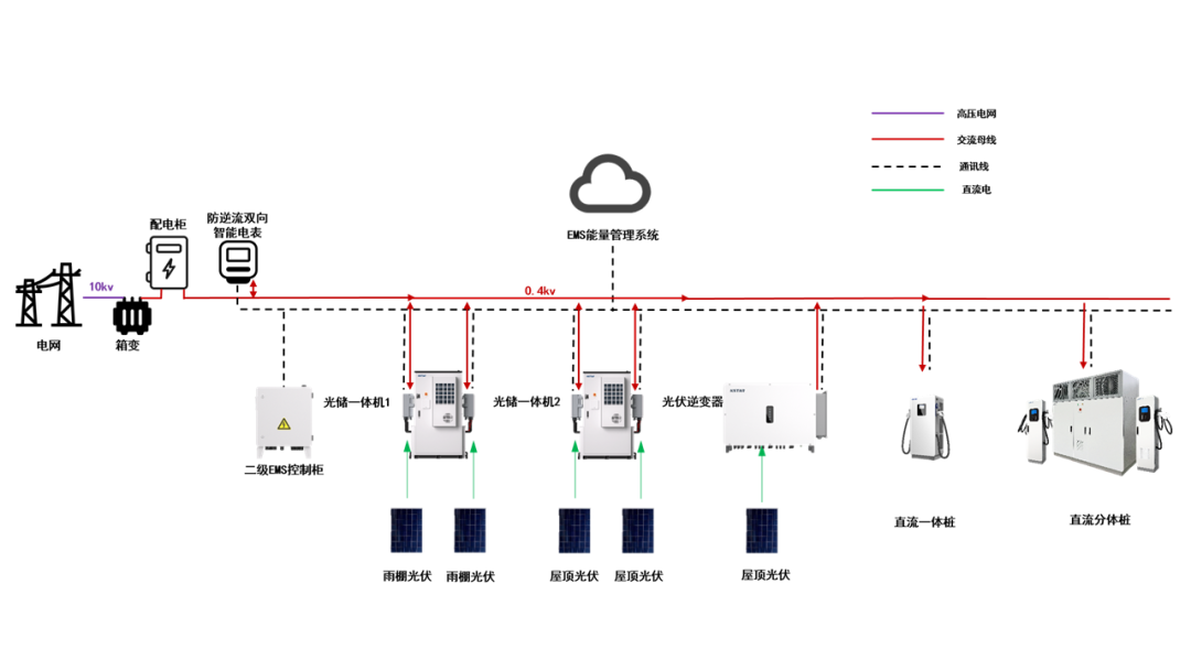 ④能量管理系統(tǒng)(EMS):作為光儲(chǔ)充系統(tǒng)的大腦和智能調(diào)度中樞,通過(guò)實(shí)時(shí)監(jiān)控與智能優(yōu)化調(diào)度,大幅提升光伏、儲(chǔ)能系統(tǒng)等能源資源的利用效率;在負(fù)荷端,精準(zhǔn)設(shè)定每一個(gè)充電樁的使用策略,以此確保電網(wǎng)負(fù)荷維持平衡,助力電網(wǎng)穩(wěn)定運(yùn)行,達(dá)成智能化、精細(xì)化管理目標(biāo),為光儲(chǔ)充系統(tǒng)的高效運(yùn)作提供堅(jiān)實(shí)保障 。