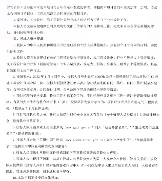 要求2022年1月1日至今,投標人須至少具有100MWh及以上規(guī)模儲能工程總承包(EPC)或施工或設(shè)計合同業(yè)績1份。