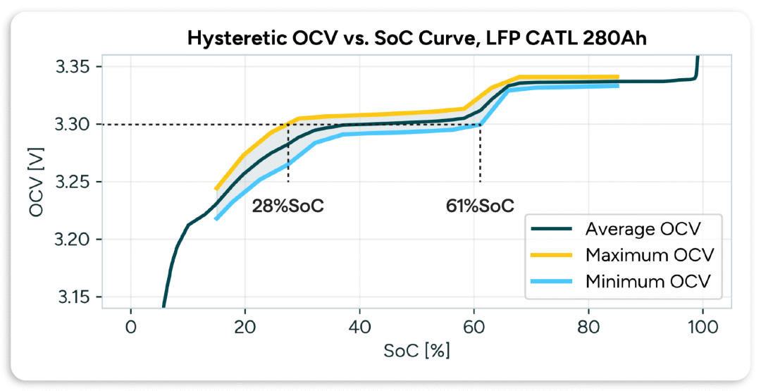 低至 40mV 的開路電壓 (OCV) 就會掩蓋靜止 LFP 電池 96% 和 38% SoC 之間的差異。