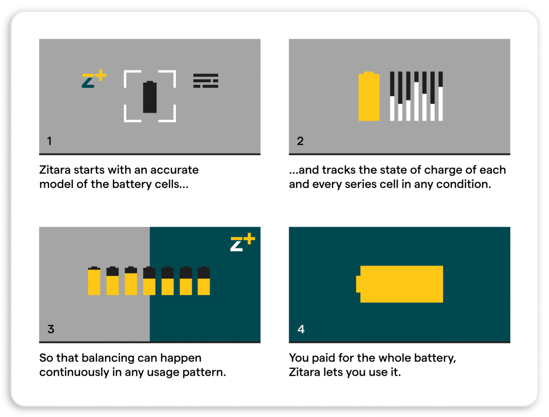 Zitara 徹底解決了這個問題。Zitara 不再通過查看電壓信號來尋找一個狹窄的平衡窗口,而是從電池電芯的精確模型開始,并在任何條件下跟蹤每個串聯(lián)電池的 SoC。
