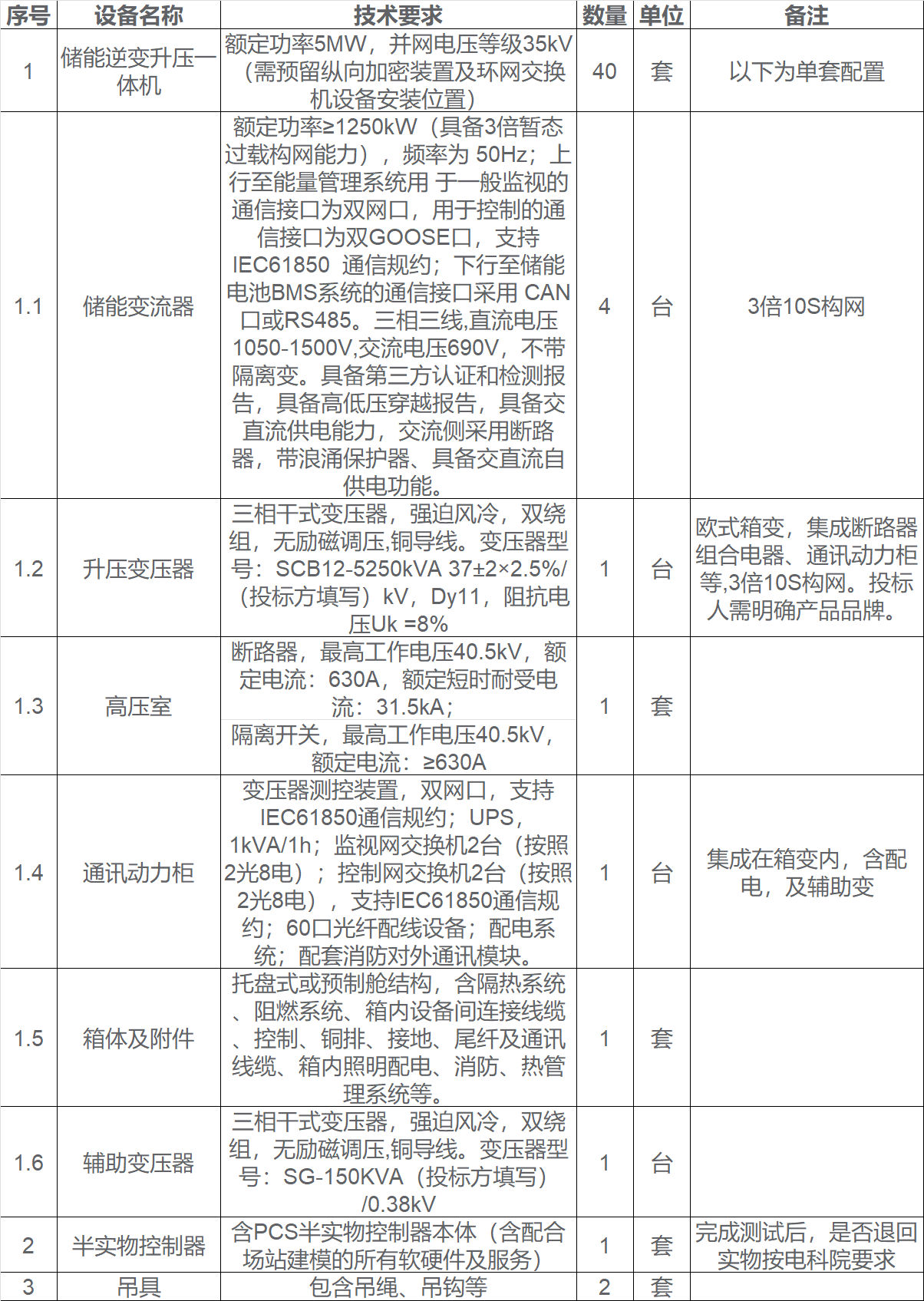 2.2招標(biāo)范圍:40套儲(chǔ)能逆變升壓一體機(jī)所需設(shè)備的供貨及指導(dǎo)安裝,包括PCS、變壓器、通訊動(dòng)力柜、高壓艙、輔助變壓器、預(yù)制艙艙體、備品備件、專用工具等。