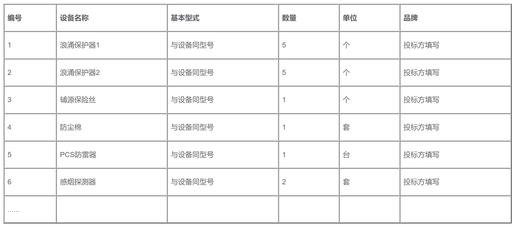 備注:投標(biāo)方所提供的全部備品備件應(yīng)能與原有部件互相替換,其質(zhì)量標(biāo)準(zhǔn)、材質(zhì)、工藝、構(gòu)造、性能、可靠性等方面均應(yīng)相同,確保在設(shè)備維護(hù)和檢修中發(fā)揮有效作用。