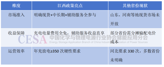 對比全國各省儲能政策,江西新政在市場化深度、收益保障和運營效率三方面表現(xiàn)尤為亮眼,具體見下表: