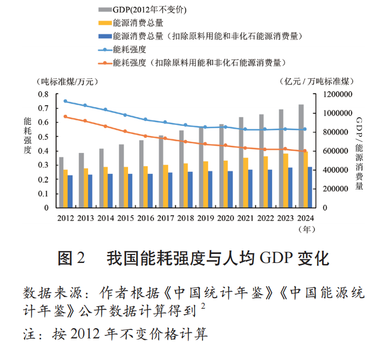 十八大以來(lái),我國(guó)深入推動(dòng)能源安全新戰(zhàn)略,即能源消費(fèi)革命、能源供給革命、能源技術(shù)革命、能源體制革命,全方位加強(qiáng)國(guó)際合作,能源效率實(shí)現(xiàn)大幅提升。2012年至2023年,我國(guó)以年均不到3.3%的能源消費(fèi)增速支撐了年均超6.1%的經(jīng)濟(jì)增長(zhǎng),能耗強(qiáng)度實(shí)現(xiàn)持續(xù)下降(見(jiàn)圖2)。一方面,非化石能源替代大大釋放了用能空間,在有效控制化石能源消費(fèi)的基礎(chǔ)上實(shí)現(xiàn)了經(jīng)濟(jì)產(chǎn)出的增長(zhǎng),2024年我國(guó)能耗強(qiáng)度(扣除原料用能和非化石能源消費(fèi))較2012年累計(jì)下降近37.74%。另一方面,作為原料使用的化石能源占比不斷提升。2022年,我國(guó)化石能源消費(fèi)量較“十三五”末增加2.67億噸標(biāo)準(zhǔn)煤,其中作為化工原料使用的增量占比達(dá)到36.41%,較“十三五”提高近9個(gè)百分點(diǎn),較“十二五”提高近14個(gè)百分點(diǎn)。2023年,受原料用能減少影響,作為燃料使用的化石能源的增量貢獻(xiàn)率回升明顯,但占能源消費(fèi)總量比重仍較2012年下降了近4個(gè)百分點(diǎn)。這兩組數(shù)據(jù)表明我國(guó)在促進(jìn)能源效率提升的同時(shí),也推動(dòng)了能源結(jié)構(gòu)的綠色低碳轉(zhuǎn)型,有效緩解了碳達(dá)峰碳中和目標(biāo)對(duì)經(jīng)濟(jì)發(fā)展能源需求的約束壓力。
