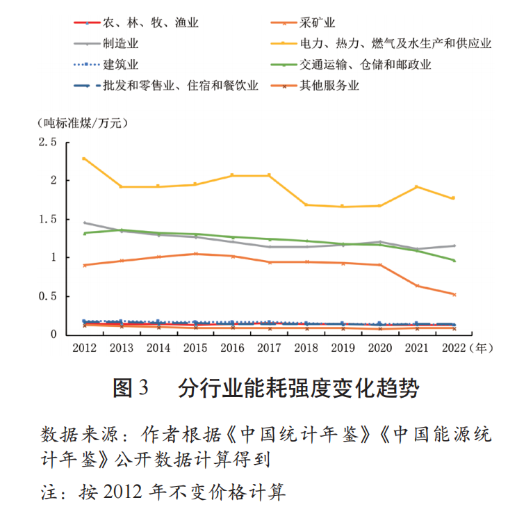 受生產(chǎn)方式、技術(shù)工藝和產(chǎn)品特性等因素影響,不同行業(yè)的能耗強(qiáng)度存在明顯差異,把握這些行業(yè)特征才能在推進(jìn)重點(diǎn)領(lǐng)域綠色低碳轉(zhuǎn)型的過(guò)程中做到有的放矢。根據(jù)能源統(tǒng)計(jì)的行業(yè)劃分,以及各行業(yè)能耗強(qiáng)度平均水平和變化趨勢(shì),可將八個(gè)行業(yè)按能源生產(chǎn)率高低劃分為低產(chǎn)出效益行業(yè)和高產(chǎn)出效益行業(yè)兩類(見(jiàn)圖3),其中電力、熱力、燃?xì)饧八a(chǎn)和供應(yīng)業(yè),制造業(yè),交通運(yùn)輸、倉(cāng)儲(chǔ)和郵政業(yè),采礦業(yè)四部門屬于低產(chǎn)出效益行業(yè);建筑業(yè)、批發(fā)和零售業(yè)、住宿和餐飲業(yè)、其他服務(wù)業(yè)屬于高產(chǎn)出效益行業(yè)。2022年,八個(gè)行業(yè)能耗強(qiáng)度較2012年均有明顯下降,按降幅由高到低依次為采礦業(yè),其他服務(wù)業(yè),建筑業(yè),交通運(yùn)輸、倉(cāng)儲(chǔ)和郵政業(yè),電力、熱力、燃?xì)饧八a(chǎn)和供應(yīng)業(yè),制造業(yè),批發(fā)和零售業(yè)、住宿和餐飲業(yè),農(nóng)、林、牧、漁業(yè)。按能耗強(qiáng)度降低的絕對(duì)值排名,由高到低依次為電力、熱力、燃?xì)饧八a(chǎn)和供應(yīng)業(yè),采礦業(yè),交通運(yùn)輸、倉(cāng)儲(chǔ)和郵政業(yè),制造業(yè),建筑業(yè),其他服務(wù)業(yè),批發(fā)和零售業(yè)、住宿和餐飲業(yè),農(nóng)、林、牧、漁業(yè)。結(jié)合各行業(yè)能源消費(fèi)規(guī)模來(lái)看,十八大以來(lái),我國(guó)能耗強(qiáng)度的下降主要得益于能源消費(fèi)占比較高的制造業(yè)的能耗強(qiáng)度下降,以及低能耗強(qiáng)度的其他服務(wù)業(yè)能源消費(fèi)占比的提升。