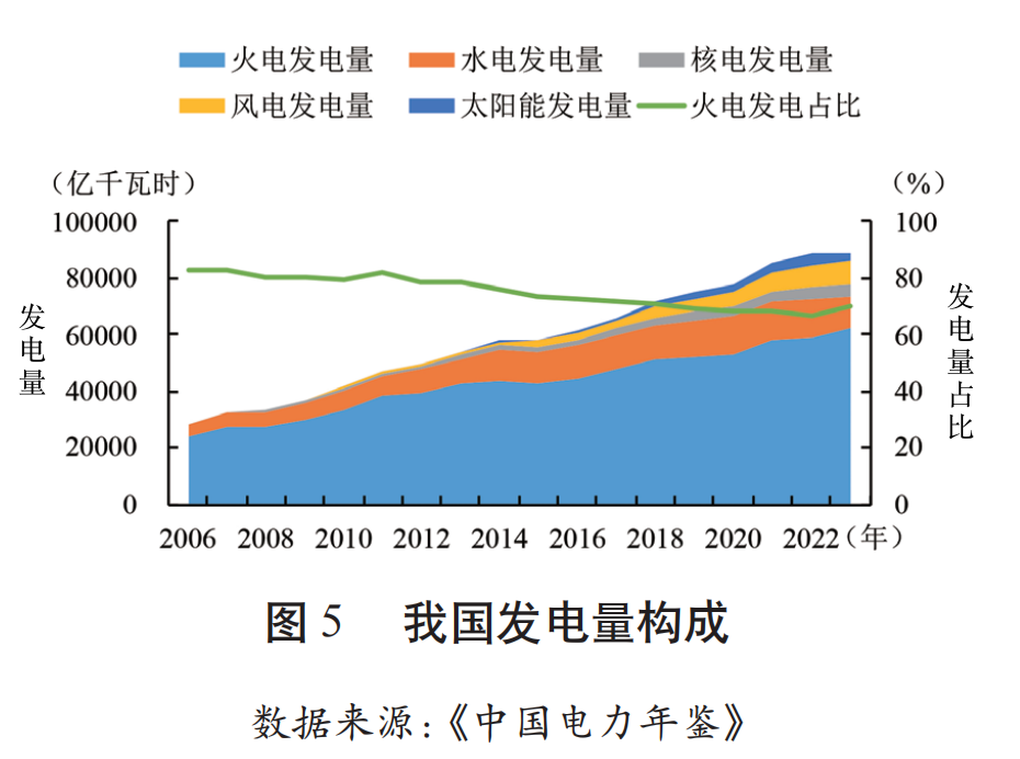 當(dāng)前,我國(guó)已基本形成了煤炭、石油、天然氣、可再生能源等多元能源供給體系。煤炭占一次能源消費(fèi)比重由2011年的70.2%降至2023年的54.5%,天然氣、水電、核電、風(fēng)電、太陽(yáng)能發(fā)電等清潔能源消費(fèi)占比提升至26.1%,但煤炭占一次能源消費(fèi)比重占比仍在50%以上。從電力結(jié)構(gòu)看(見(jiàn)圖5),近15年來(lái)盡管燃煤發(fā)電量在全部發(fā)電量中的比重持續(xù)保持下降趨勢(shì),但在2022年仍然占據(jù)66.55%,我國(guó)能源結(jié)構(gòu)偏煤高碳特征依舊明顯。