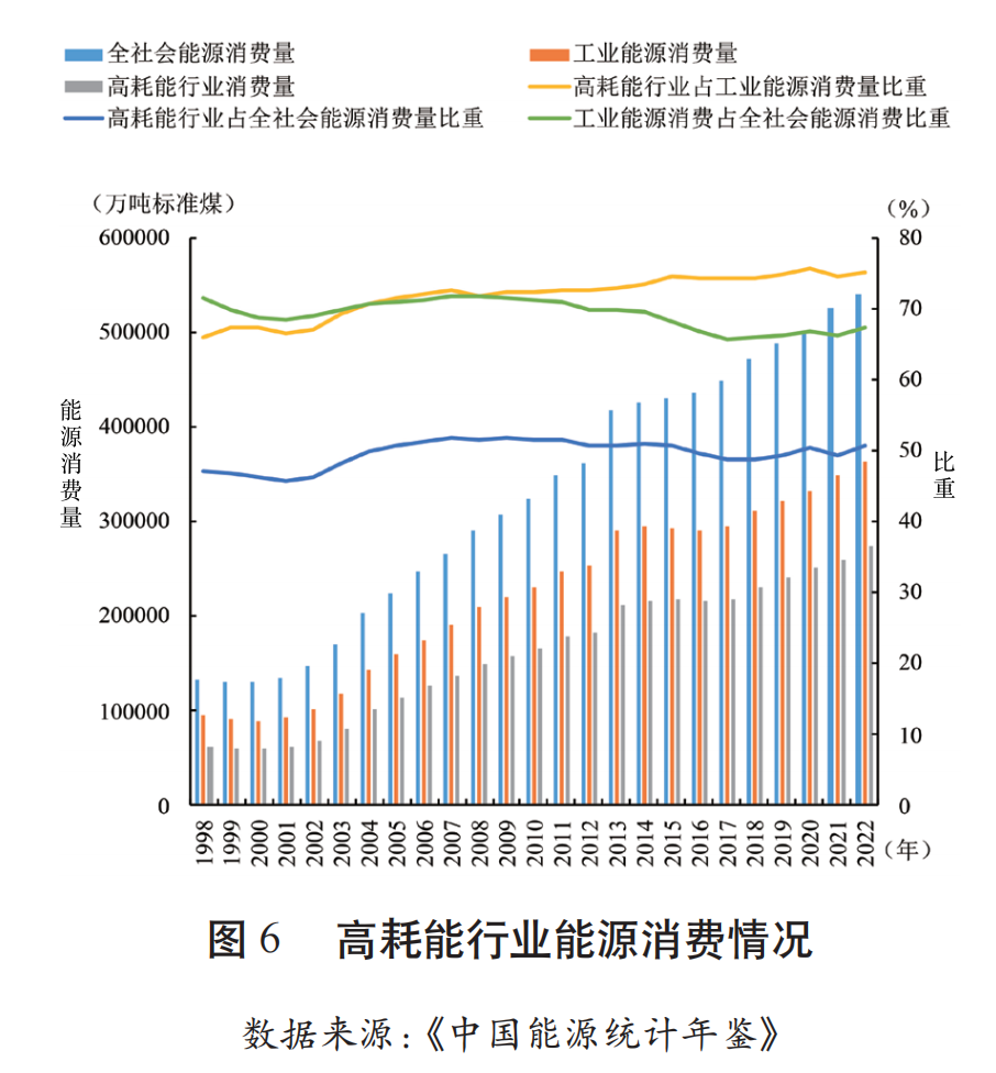 改革開放以來(lái),我國(guó)經(jīng)濟(jì)實(shí)現(xiàn)歷史性跨越,能源消費(fèi)需求持續(xù)上升。特別是加入世界貿(mào)易組織WTO后,我國(guó)商品市場(chǎng)、貨物市場(chǎng)、投資市場(chǎng)向世界開放,能源密集型工業(yè)生產(chǎn)的投資快速增加,能源消費(fèi)進(jìn)入高速增長(zhǎng)階段。2002~2005年僅四年時(shí)間,我國(guó)能源消費(fèi)增量便已超過(guò)1978~2001年共23年的增量總和?!笆晃濉币詠?lái),我國(guó)先后提出節(jié)能降耗量化目標(biāo)和“能源革命”重大戰(zhàn)略思想,實(shí)行能源消耗總量和強(qiáng)度“雙控”行動(dòng),能源消費(fèi)增勢(shì)有所減緩,增速?gòu)?011年的7.32%逐步回落至2015年的1.35%。但全球新一輪科技革命和產(chǎn)業(yè)變革的不斷推進(jìn),拉動(dòng)能源消費(fèi)需求急劇增加,能源消費(fèi)增速開始回升。2024年,我國(guó)能源消費(fèi)總量已達(dá)59.6億噸標(biāo)準(zhǔn)煤,“十四五”前四年能源消費(fèi)總量年均增速達(dá)4.58%,高出整個(gè)“十三五”時(shí)期能源消費(fèi)年均增速1.78個(gè)百分點(diǎn)。