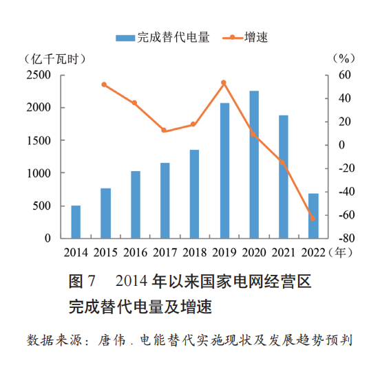電能替代是提高全社會(huì)電氣化水平、改善居民生活質(zhì)量、提升社會(huì)生產(chǎn)效率、緩解能源碳排放的重要途徑。據(jù)測(cè)算[10] ,電能在終端能源消費(fèi)中的占比每提高1個(gè)百分點(diǎn),我國(guó)單位GDP能耗就可下降2個(gè)百分點(diǎn)~4個(gè)百分點(diǎn)。自電能替代工作全面啟動(dòng)以來(lái),電鍋爐、港口岸電、電動(dòng)汽車等電能替代技術(shù)不斷發(fā)展成熟并推廣應(yīng)用,國(guó)家發(fā)展和改革委員會(huì)、國(guó)家能源局、生態(tài)環(huán)境部等部門先后出臺(tái)多項(xiàng)政策為電能替代提供有序指引,我國(guó)電能占終端能源消費(fèi)比重穩(wěn)步增長(zhǎng),2012年電能占終端能源消費(fèi)比重為19.3%,2023年這一比例上升至28%,累計(jì)提高近9個(gè)百分點(diǎn)。但近年來(lái)我國(guó)電能替代增速開始放緩,從國(guó)家電網(wǎng)經(jīng)營(yíng)區(qū)替代電量變化來(lái)看[11] (見(jiàn)圖7),2014至2020年,實(shí)施替代電量由503億千瓦時(shí)迅速增加至2252億千瓦時(shí),年均增速達(dá)28.38%,隨后一路下降,2022年完成替代電量?jī)H為684億千瓦時(shí),年均增速-81.45%。技術(shù)和經(jīng)濟(jì)是制約再電氣化縱深推進(jìn)的兩個(gè)主要因素。技術(shù)方面,一是風(fēng)電、光伏等發(fā)電的波動(dòng)性和不穩(wěn)定性,以及儲(chǔ)能技術(shù)的成本和效率問(wèn)題等,導(dǎo)致電源側(cè)電能供應(yīng)清潔化水平不足[12] 。增容技術(shù)尚未完全成熟,電網(wǎng)擴(kuò)容難度較大,導(dǎo)致電網(wǎng)側(cè)應(yīng)對(duì)用電負(fù)荷快速增長(zhǎng)面臨較大壓力。二是電能替代的各項(xiàng)技術(shù)或設(shè)備的技術(shù)經(jīng)濟(jì)性仍然偏低,導(dǎo)致用戶側(cè)電能替代意愿不夠積極。此外,產(chǎn)品標(biāo)準(zhǔn)的缺失也使得產(chǎn)品和服務(wù)質(zhì)量難以得到有效保障。