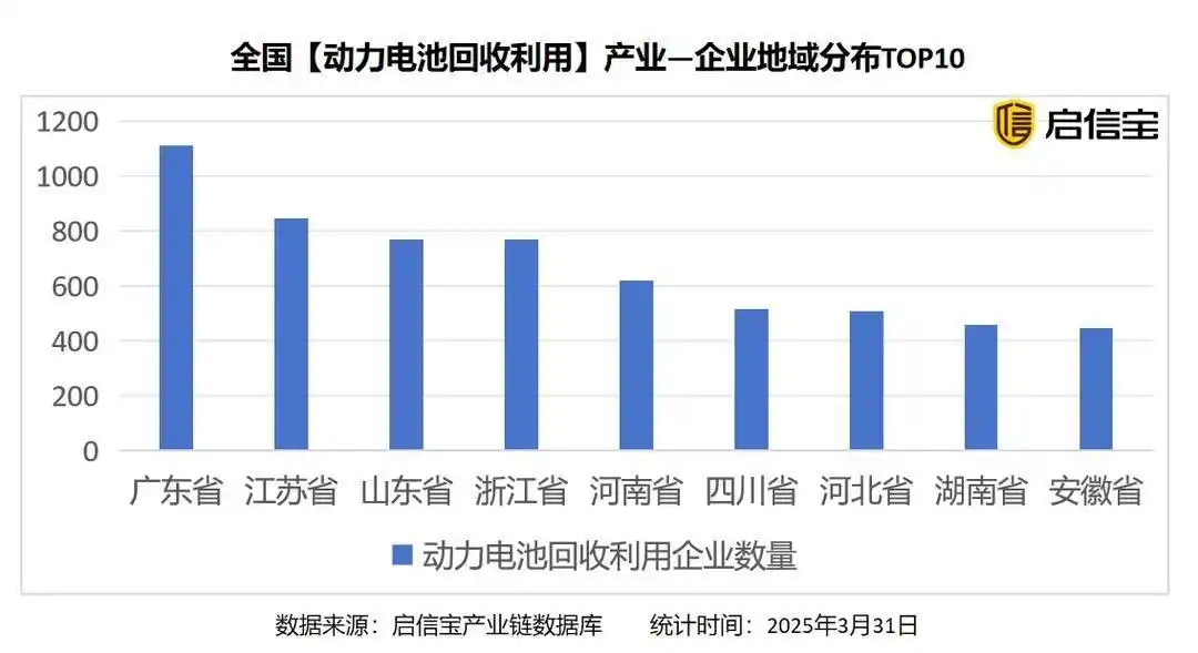 數(shù)據(jù)庫顯示,截至2025年3月,全國“動力電池回收利用”產(chǎn)業(yè)相關(guān)企業(yè)主要集中在廣東省、江蘇省,其中廣東省以1109家企業(yè)數(shù)量位居全國第一,占比10.3%。江蘇省則以844家企業(yè)數(shù)量位居第二,占比7.8%。廣東以市場化整合見長,依托頭部企業(yè)構(gòu)建閉環(huán)產(chǎn)業(yè)鏈;江蘇則通過政策規(guī)范+技術(shù)研發(fā)打造高標(biāo)準(zhǔn)回收體系。