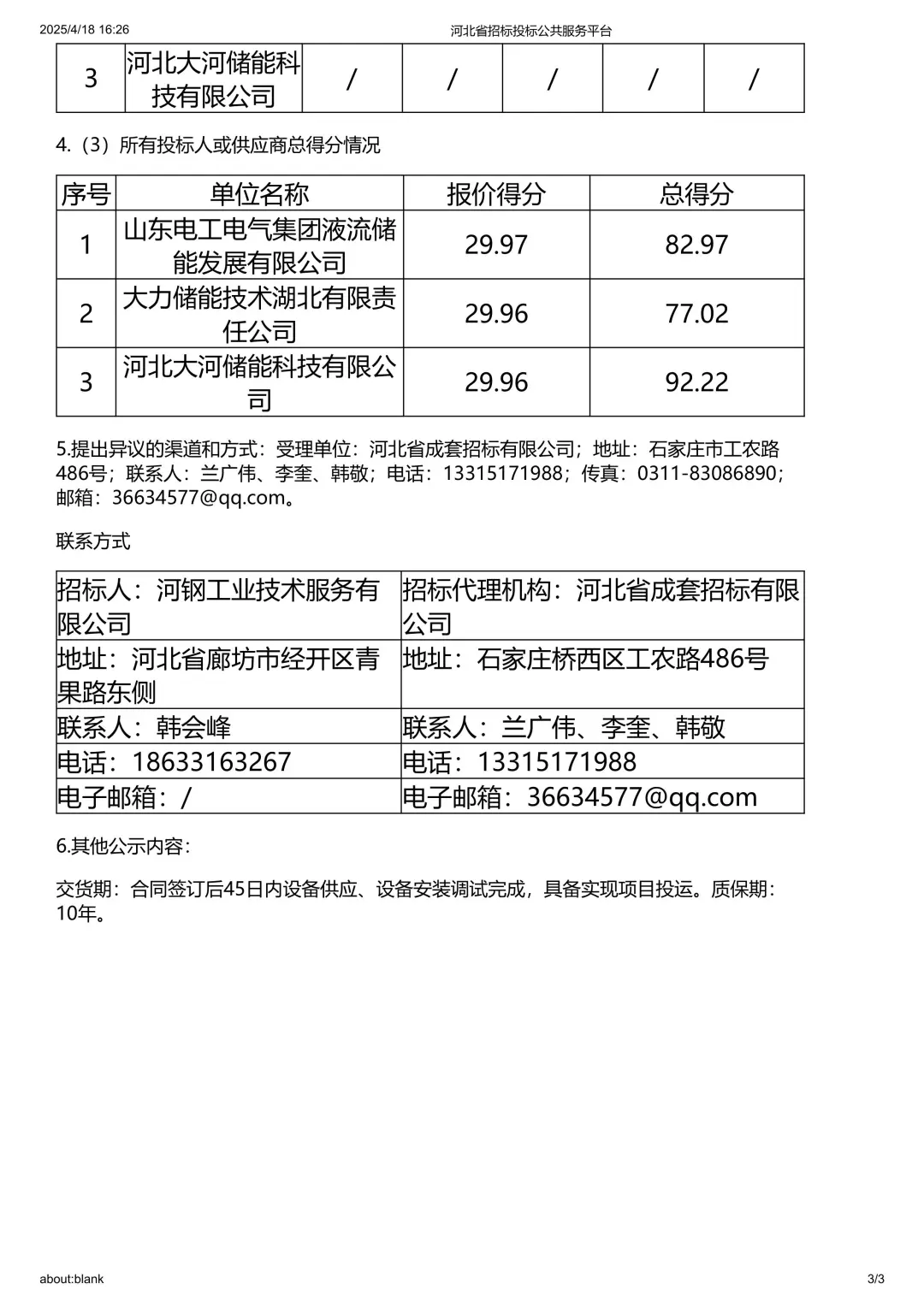 中標(biāo)候選人第1名:河北大河儲(chǔ)能科技有限公司,投標(biāo)價(jià)格:49824200元,折合單價(jià):2.491元/Wh;