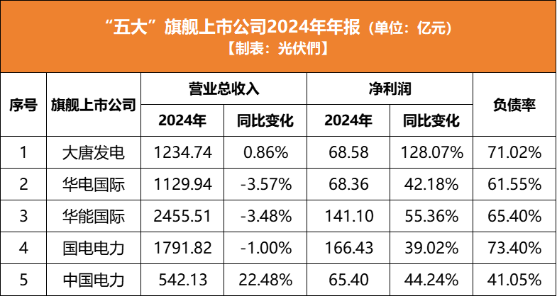 中國儲(chǔ)能網(wǎng)訊:截至本周,“五大發(fā)電集團(tuán)”旗艦上市公司的2024年財(cái)報(bào)均已披露完成。光伏們從營(yíng)業(yè)總收入、凈利潤(rùn)、負(fù)債率三個(gè)維度統(tǒng)計(jì)5家上市企業(yè)2024年經(jīng)營(yíng)數(shù)據(jù),如下: