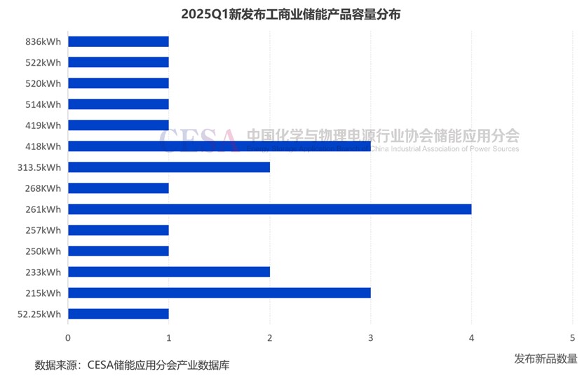隨著工商業(yè)儲(chǔ)能單體大項(xiàng)目越來(lái)越多,外加土地資源緊張等因素,工商業(yè)儲(chǔ)能電池柜也朝著大型化發(fā)展。2025年1季度發(fā)布的23款明確規(guī)模的工商業(yè)儲(chǔ)能柜中,有8款容量在400kWh以上,超過(guò)三分之一,最大容量為2月東方日升在日本發(fā)布的eFlex 836kWh液冷儲(chǔ)能系統(tǒng)。此外,陽(yáng)光電源、科陸電子、鵬輝能源都發(fā)布了超500kWh工商業(yè)儲(chǔ)能新產(chǎn)品。