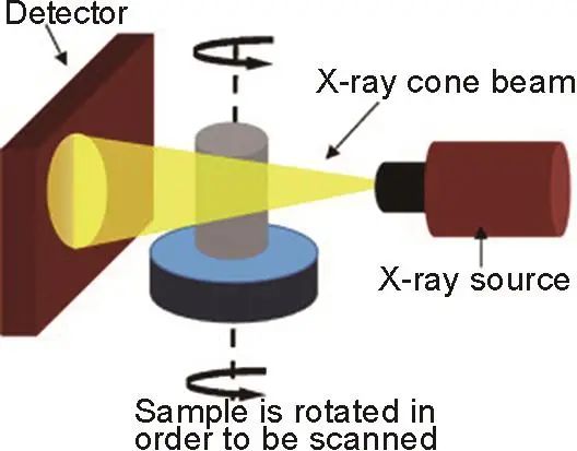 催化層孔結(jié)構(gòu)的三維表征通常以Nano-CT和FIB-SEM為主。Nano-CT的基本原理如圖3所示,X射線源產(chǎn)生的光子穿過樣品,一部分未被樣品吸收的光子將被光子探測器收集,在那里X射線被轉(zhuǎn)換成電流,用來產(chǎn)生數(shù)字圖像。通過旋轉(zhuǎn)樣品以獲得多個二維投影圖像,利用這些圖像可重建三維圖像[15]。
