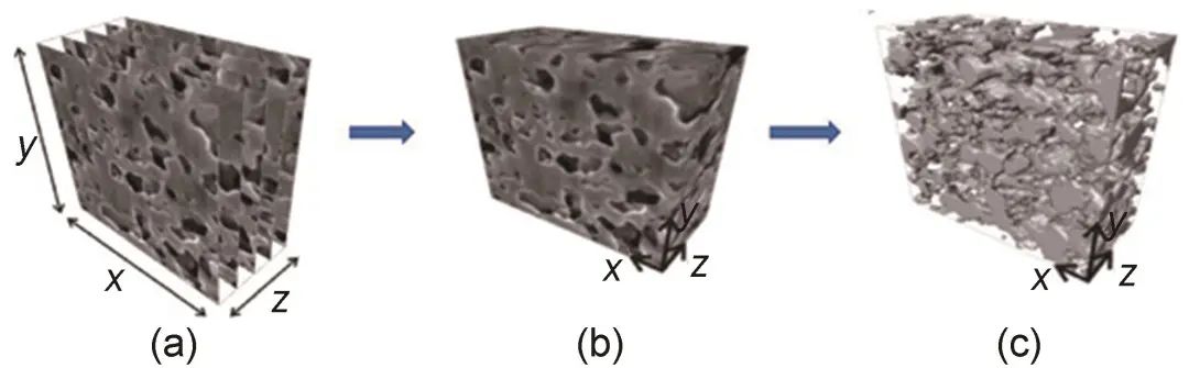 圖4FIB-SEM三維重構(gòu)過程。(a)使用FIB-SEM生產(chǎn)圖像集,(b)三維成像重建,(c)定量三維重構(gòu)和建模[20]