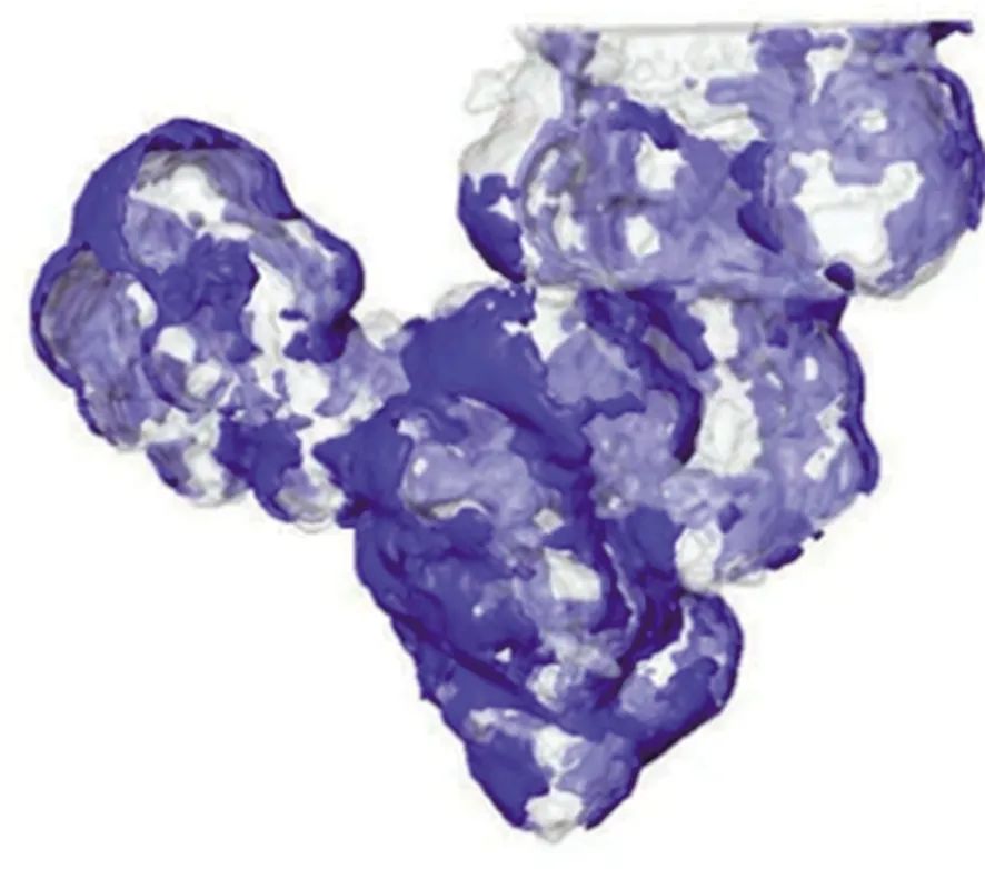 圖6常規(guī)催化層內(nèi)沉積在炭黑上的離聚物層電子斷層成像圖(藍(lán)色和淺藍(lán)色區(qū)域?qū)?yīng)于離聚物)[30]