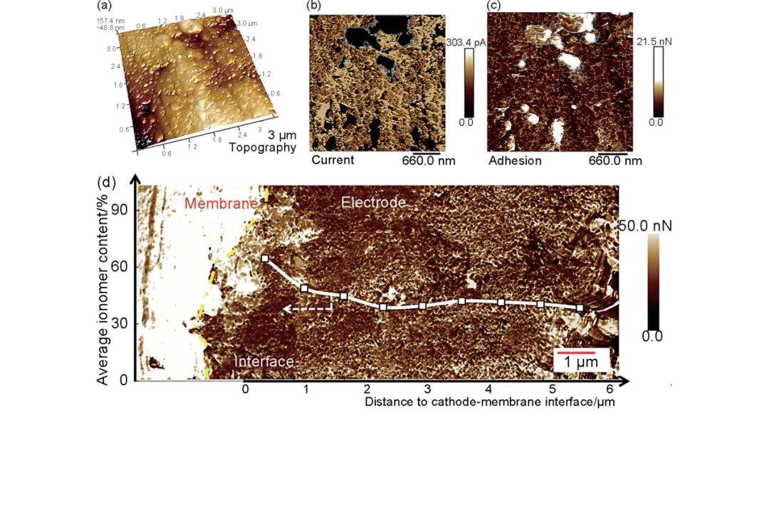 Hiesgen等人[31]則利用原子力顯微鏡(atomic force microscope, AFM),原位表征了離聚物在CCL內(nèi)的分布情況。如圖8(a)所示,僅憑三維形貌圖,人們很難區(qū)分出離聚物與Pt/C,但是利用離聚物與Pt/C之間在導(dǎo)電性[圖8(b)]和黏附力[圖8(c)]方面的差異,就可以分辨出低導(dǎo)電性和高黏附性的離聚物相(圖中虛線框內(nèi))。他們用這種方法研究了CCL內(nèi)離聚物分布的梯度,如圖8(d)所示,離聚物含量隨著膜/催化層界面距離的增加而減小,膜/催化層界面處較高的離聚物含量可能是MEA制備過程中熱壓造成的。