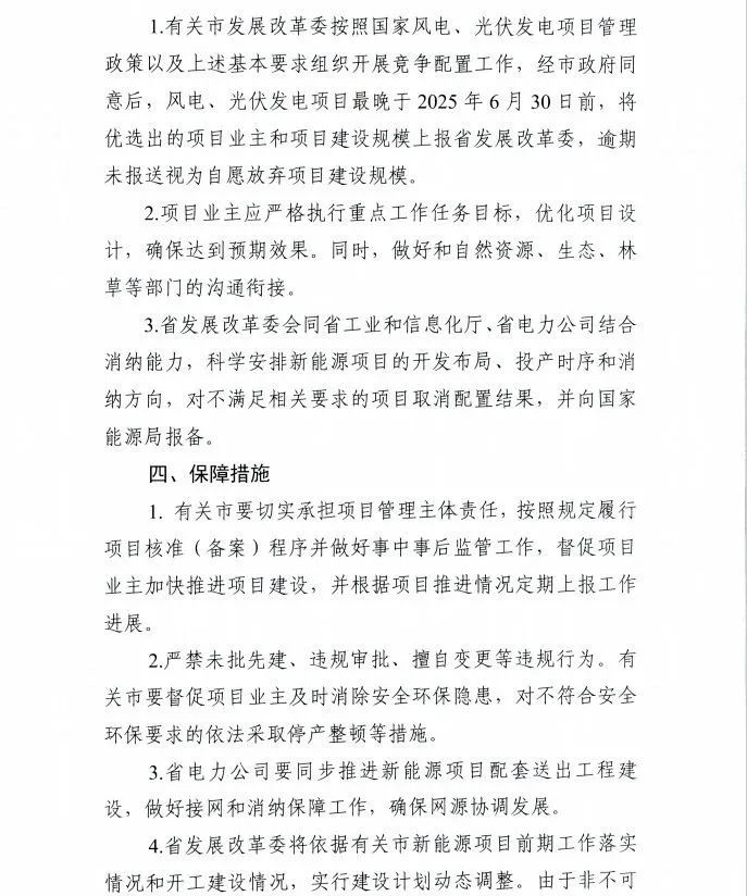 風(fēng)電、光伏發(fā)電項(xiàng)目最晚于2025年6月30日前,將優(yōu)選出的項(xiàng)目業(yè)主和項(xiàng)目建設(shè)規(guī)模上報省發(fā)展改革委,逾期未報送視為自愿放棄項(xiàng)目建設(shè)規(guī)模。