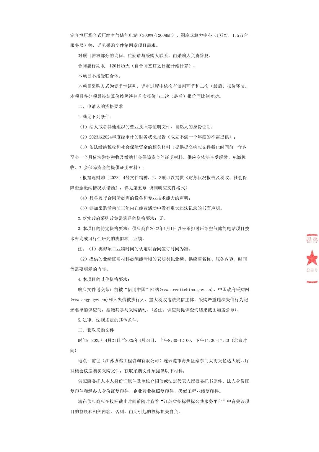 采購需求:初步查明連云港錦屏磷礦東西兩個(gè)采空區(qū)之間的工程地質(zhì)條件、巖體巖性等。開展連云港錦屏磷礦采空區(qū)、廢棄礦井及地下水調(diào)查工作,初步研判連云港錦屏磷礦改造壓縮空氣儲(chǔ)能電站地下工程建設(shè)的可能性。提供連云港錦屏磷礦改造壓縮空氣儲(chǔ)能電站地下工程初步方案和初步預(yù)算,包括但不限于:定容壓縮空氣儲(chǔ)能電站(300MW/1200MWh)、定容恒壓耦合式壓縮空氣儲(chǔ)能電站(300MW/1200MWh)、洞庫式算力中心(1萬㎡,1.5萬臺(tái)服務(wù)器)等,詳見采購文件第四章項(xiàng)目需求。