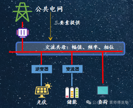 在交流組網(wǎng)的方式下,各個要素的匯聚點,就是交流母線,而一個交流系統(tǒng)的三要素,就會體現(xiàn)在母線的電壓幅值、頻率和相位中。