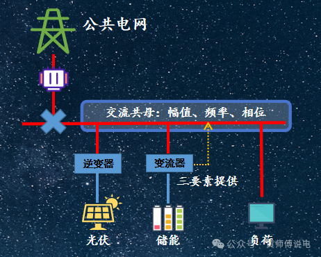 既然提到穩(wěn)定,那就和光伏沒啥關(guān)系了,所以一般此時的交流母線三要素是由儲能系統(tǒng)來提供的,儲能變流器的工作狀態(tài)就不叫跟網(wǎng)了,而是構(gòu)網(wǎng)。