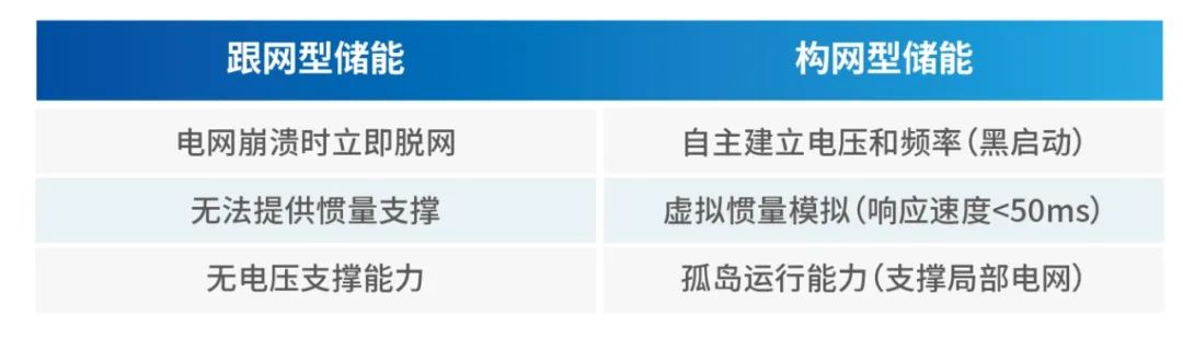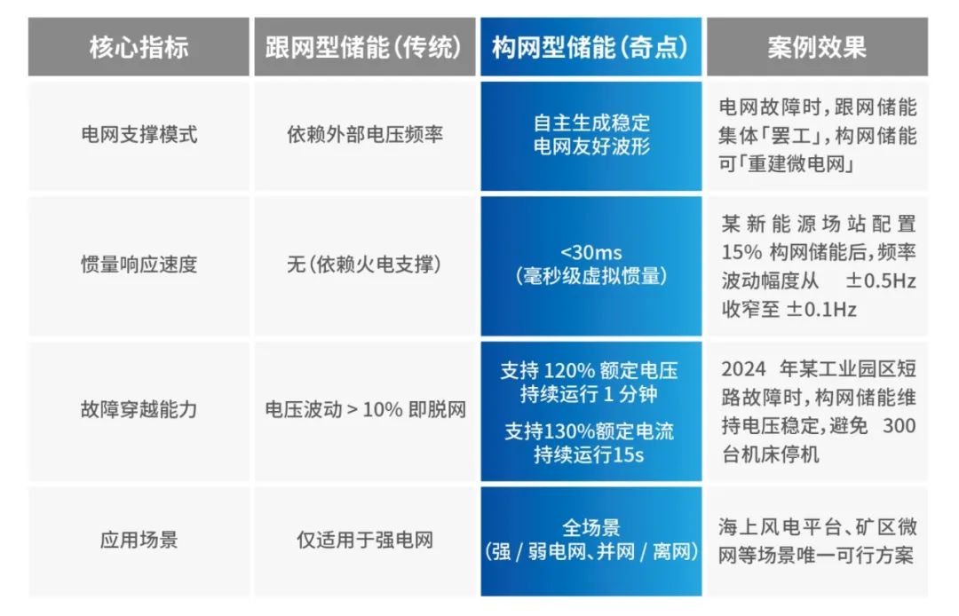 在電網支撐能力方面,傳統(tǒng)跟網儲能依賴電網指令行動,斷電時只能被動退出。構網儲能則能自主建立電壓和頻率,在電網崩潰時快速“重建秩序”。