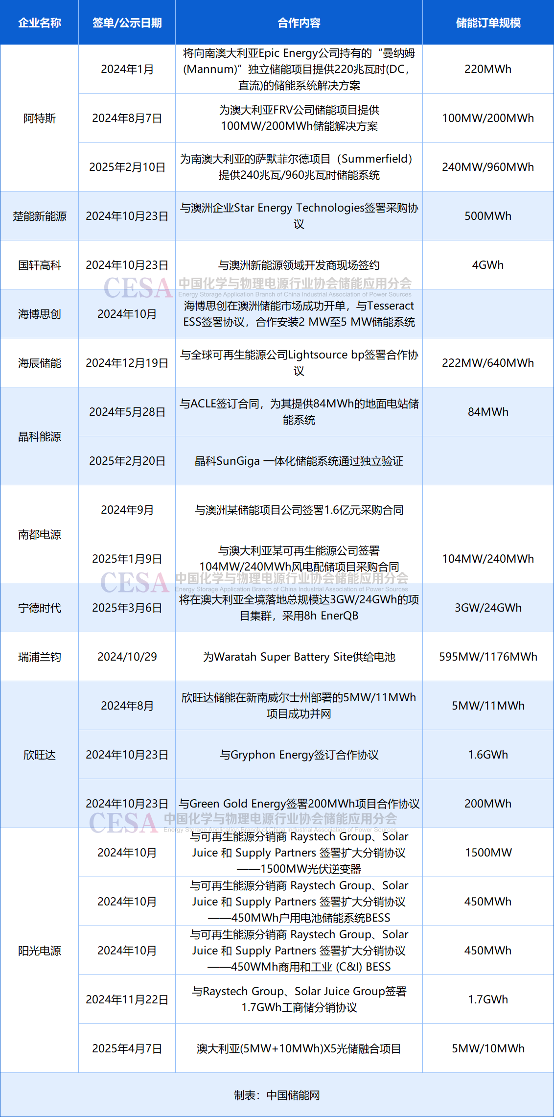 表2024年以來在澳布局的中國儲能企業(yè)(根據(jù)公開信息不完全統(tǒng)計)