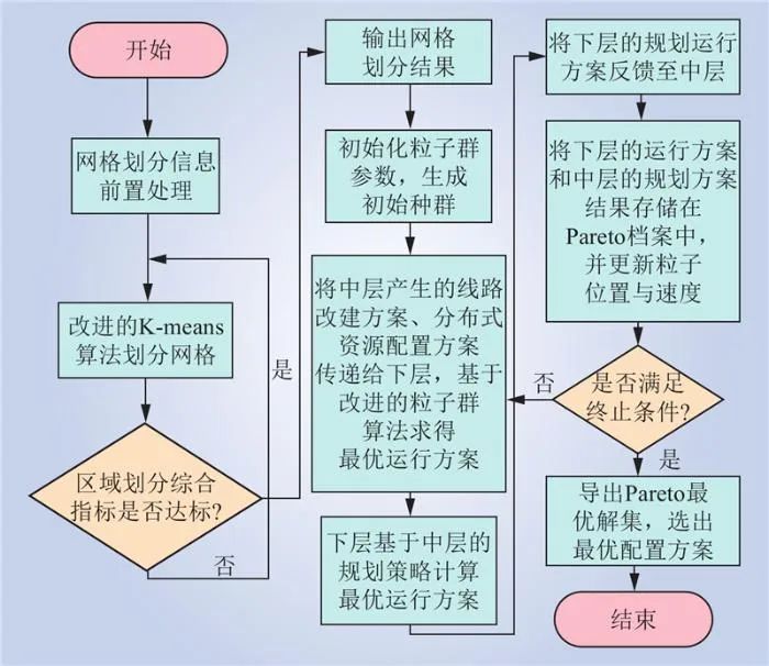 本文所述3層規(guī)劃模型求解流程如圖4所示。決策層采用改進(jìn)的K-means算法劃分供電網(wǎng)格。規(guī)劃層和運(yùn)行層采用改進(jìn)的粒子群算法和優(yōu)化的數(shù)據(jù)驅(qū)動(dòng)方法確定最優(yōu)規(guī)劃方案。