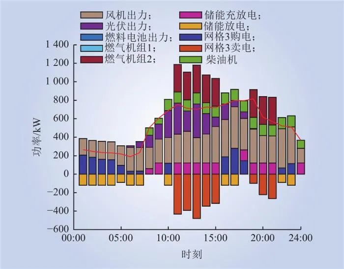 根據(jù)規(guī)劃方案求解出的典型日最優(yōu)運(yùn)行方案如圖7~9所示。綜合圖7~9可得,各區(qū)域在風(fēng)光大發(fā)時(shí),儲(chǔ)能設(shè)備進(jìn)行充電,并在用電高峰期間,將電能出售給電網(wǎng),在低谷期進(jìn)行購(gòu)電和儲(chǔ)能設(shè)備充電,實(shí)現(xiàn)對(duì)分布式資源的就近消納,同時(shí)利用峰谷期的電價(jià)差實(shí)現(xiàn)運(yùn)行成本的最小化。