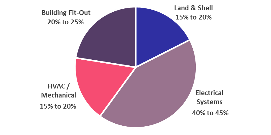 新建數(shù)據(jù)中心(指未開發(fā)或未使用的土地上進(jìn)行的新建設(shè)項(xiàng)目),包括設(shè)施運(yùn)營中使用的必要基礎(chǔ)設(shè)施和組件,通??煞譃樗拇箢悾篿)土地和建筑外殼,ii)電氣系統(tǒng),iii)暖通空調(diào)/機(jī)械/冷卻系統(tǒng),以及iv)建筑裝修。以下是每個類別的描述,以及它們的典型成本細(xì)分范圍: