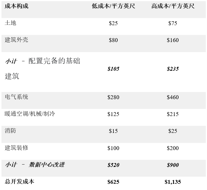 總體而言,包括配置完備的基礎(chǔ)建筑和數(shù)據(jù)中心的改進(jìn),總開發(fā)成本在每平方英尺625美元到1,135美元之間。