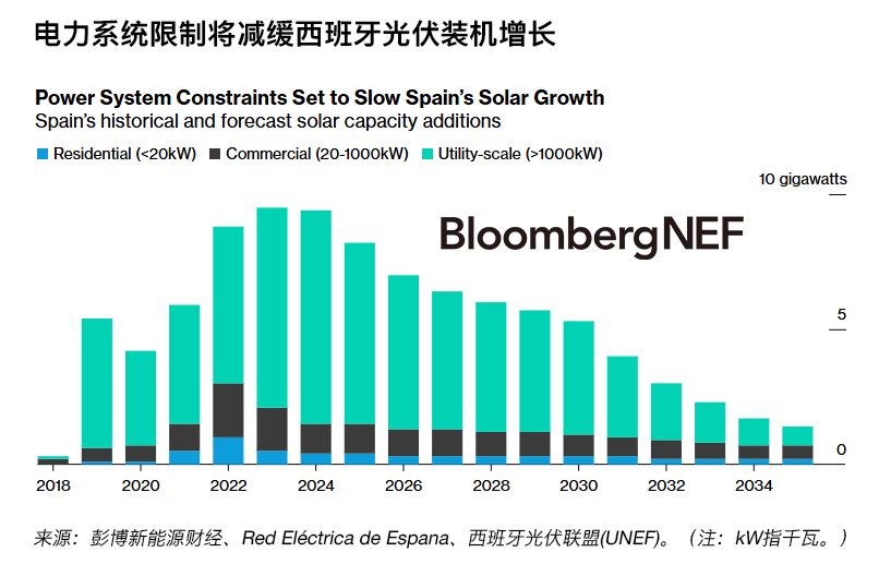 西班牙面臨的一大挑戰(zhàn)是缺乏對(duì)用戶(hù)側(cè)光伏的準(zhǔn)確統(tǒng)計(jì),因?yàn)楫?dāng)局未能全面掌握自發(fā)自用光伏系統(tǒng)的情況。彭博新能源財(cái)經(jīng)估計(jì),西班牙實(shí)際安裝的光伏組件容量比西班牙電網(wǎng)運(yùn)營(yíng)商REE記錄值高出約10.5GW。彭博新能源財(cái)經(jīng)綜合REE(跟蹤大型地面項(xiàng)目)和西班牙行業(yè)協(xié)會(huì)UNEF(自發(fā)自用系統(tǒng))的數(shù)據(jù)得出這一結(jié)論。