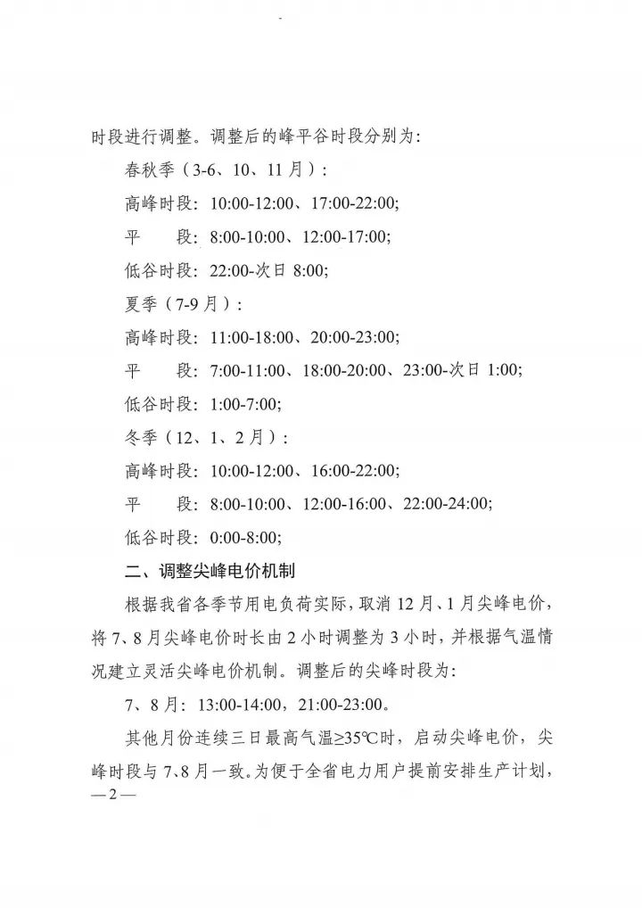 尖峰電價調(diào)整:取消12月、1月尖峰電價。將7、8月尖峰電價時長由2小時調(diào)整為3小時(13:00-14:00,21:00-23:00),其他月份連續(xù)三日最高氣溫>35℃時,啟動尖峰電價。