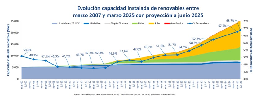 智利能源部報告數(shù)據(jù)顯示,截至2025年3月底,智利發(fā)電設施凈裝機容量達35.927GW。目前,可再生能源裝機占比達到68%,其中光伏、風電等非傳統(tǒng)可再生能源裝機占比達48%。