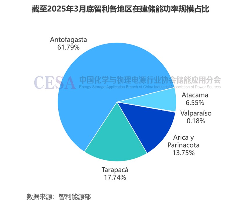 截至2025年3月31日,智利共有12個鋰電池儲能系統(tǒng)正在建設中,總規(guī)模1.68GW/6.122GWh,總投資21.4億美元(折合人民幣155.71億元),其中安托法加斯塔地區(qū)在建項目規(guī)模達1.038GW/3.883GWh,功率規(guī)模占比61.79%。