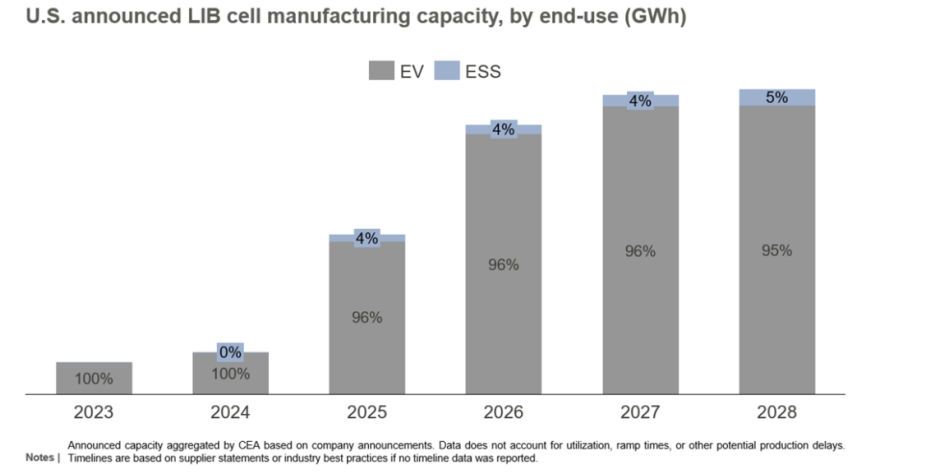 美國2023~2028年用于電動汽車和電池儲能系統(tǒng)的電池產(chǎn)能(GWh)