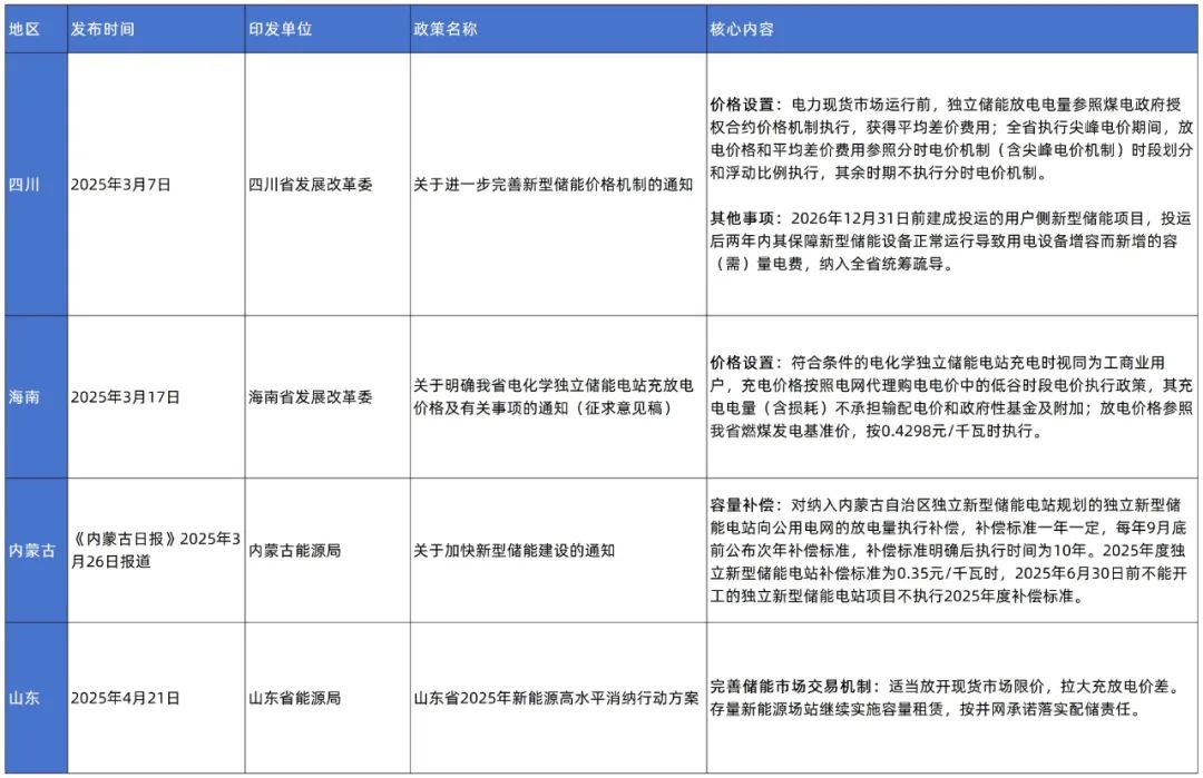 內(nèi)蒙古、河北實(shí)行獨(dú)立儲(chǔ)能容量補(bǔ)償政策。內(nèi)蒙古對(duì)納入規(guī)劃的獨(dú)立儲(chǔ)能向電網(wǎng)的放電量進(jìn)行補(bǔ)償,補(bǔ)償標(biāo)準(zhǔn)一年一定,補(bǔ)償標(biāo)準(zhǔn)明確后執(zhí)行時(shí)間為10年,2025年度的補(bǔ)償標(biāo)準(zhǔn)為0.35元/千瓦時(shí)。河北繼續(xù)執(zhí)行獨(dú)立儲(chǔ)能容量電價(jià)激勵(lì)機(jī)制,儲(chǔ)能電站按并網(wǎng)時(shí)間先后競(jìng)爭(zhēng)獲得容量補(bǔ)償,年度含稅容量電價(jià)為100元/千瓦,2024年已按容量電價(jià)激勵(lì)政策退坡機(jī)制執(zhí)行的儲(chǔ)能電站,年度容量電價(jià)追補(bǔ)至100元/千瓦。海南公布了《征求意見稿》的意見反饋情況,采納了出臺(tái)推動(dòng)新能源企業(yè)參與儲(chǔ)能容量租賃的政策、促進(jìn)獨(dú)立儲(chǔ)能容量租賃市場(chǎng)形成的建議,并提到后續(xù)將繼續(xù)推動(dòng)容量補(bǔ)償相關(guān)研究工作。