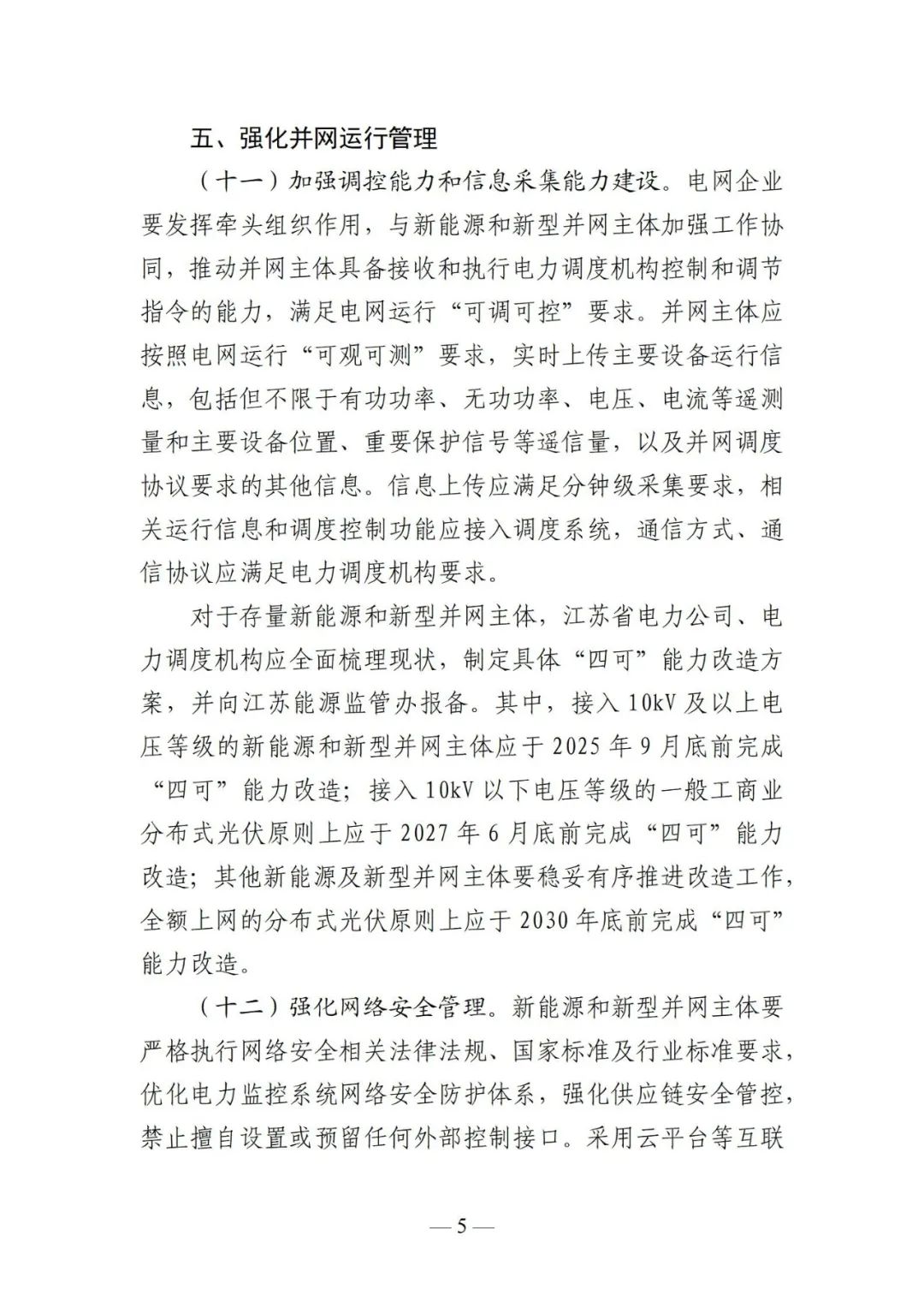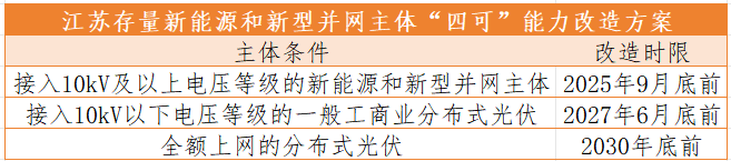 其中,接入10kV及以上電壓等級的新能源和新型并網(wǎng)主體應于2025年9月底前完成“四可”能力改造;接入10kV以下電壓等級的一般工商業(yè)分布式光伏原則上應于2027年6月底前完成“四可”能力改造;其他新能源及新型并網(wǎng)主體要穩(wěn)妥有序推進改造工作,全額上網(wǎng)的分布式光伏原則上應于2030年底前完成“四可”能力改造。