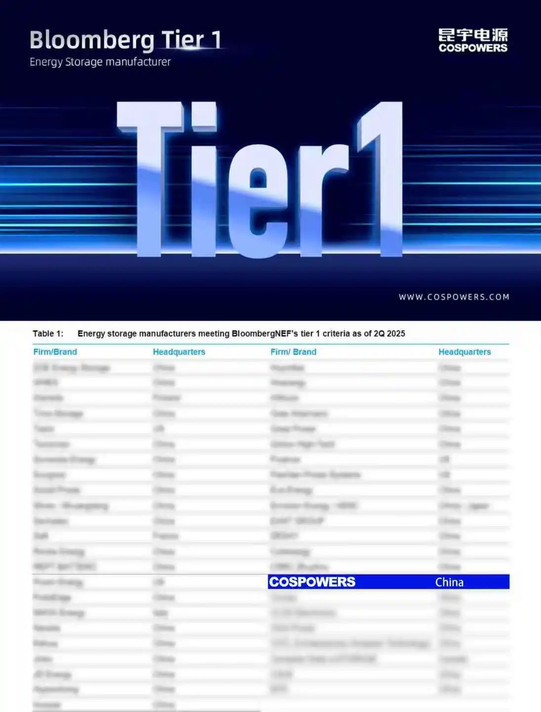中國儲能網訊:近日,國際權威研究機構BloombergNEF(彭博新能源財經,簡稱BNEF)正式發(fā)布《2025年第二季度全球儲能系統(tǒng)供應商Tier 1榜單》(BNEF Energy Storage Tier 1 List Q2 2025)。昆宇電源憑借卓越的技術創(chuàng)新實力、全球化項目交付能力及穩(wěn)健的供應鏈體系,成功躋身全球頂級儲能廠商行列。