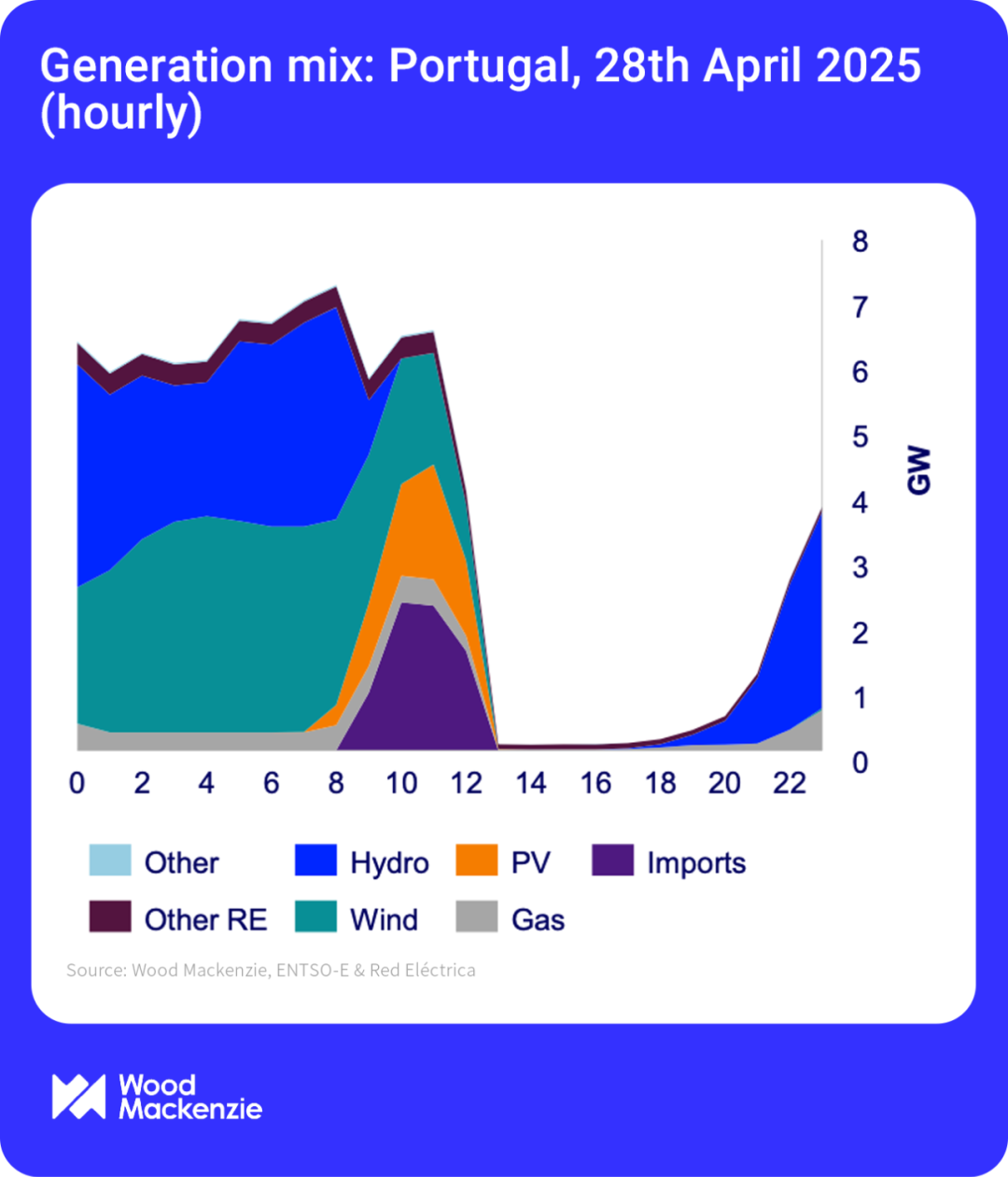 停電發(fā)生在可再生能源發(fā)電量較高的時期,光伏、風(fēng)能和水力發(fā)電提供了超過西班牙100%的用電需求。停電前,西班牙正向法國、葡萄牙和摩洛哥出口4.3GW富余電力,另有3GW容量用于補足抽水蓄能設(shè)施。