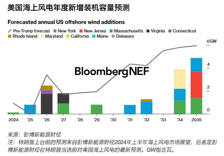 彭博新能源財經(jīng)對美國到2035年海上風電裝機容量的預測較特朗普當選前下降56%。彭博新能源財經(jīng)預計,5.7GW在建項目將繼續(xù)推進,但那些處于早期開發(fā)階段的項目面臨延遲甚至取消風險。
