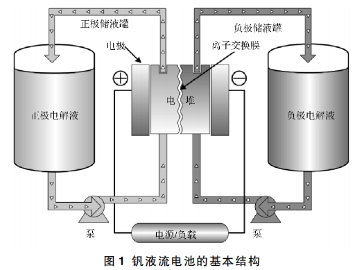 釩液流電池(Vanadium RedoxFlowBattery,VRFB)主要由電堆、正負極儲液罐、正負極電解液、正負極循環(huán)泵、離子交換膜以及流通管路組成。正極電解液和負極電解液分別儲存在獨立的儲液罐中,通過循環(huán)泵驅動電解液在儲罐與電堆之間循環(huán)流動。電堆是電池的核心反應單元,由多層單體電池構成,每個單體電池包含正負極電極和位于其間的離子交換膜。離子交換膜具備高選擇透過性,能阻隔正負極電解液的交叉混合,同時允許釩離子通過,以維持電化學反應的電荷平衡。電解液在電極表面發(fā)生氧化還原反應,電化學能量利用外部電路轉化為電能輸出或進行充電儲能。這種設計使得釩液流電池能有效平衡分布式能源系統(tǒng)中可再生能源發(fā)電的不穩(wěn)定性,優(yōu)化能量管理,提升系統(tǒng)的整體可靠性和運行效率。釩液流電池的基本結構如圖1所示。