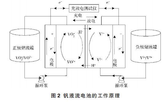 在上述過程中,循環(huán)泵用于保持電解液在儲液罐和電解池之間的流動,確保反應的持續(xù)進行。總體而言,釩液流電池憑借其可逆的氧化還原反應、高效的能量轉換及循環(huán)使用的特點,能在分布式能源系統(tǒng)中實現(xiàn)穩(wěn)定的儲能和電力供應。釩液流電池的工作原理如圖2所示。