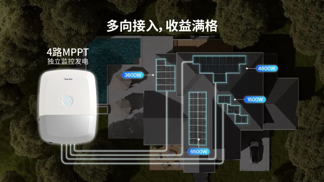 禾邁HIT系列混合逆變器憑借4路獨立MPPT精準追蹤光伏組件的最大功率點輸出,完美適配多朝向復雜屋頂結(jié)構(gòu),確保各個方位的組件都能實現(xiàn)高效發(fā)電。其高達98.5%的峰值轉(zhuǎn)換效率,顯著提升了系統(tǒng)整體發(fā)電性能,有效解決了多臺空調(diào)長時間運行帶來的高耗電難題。