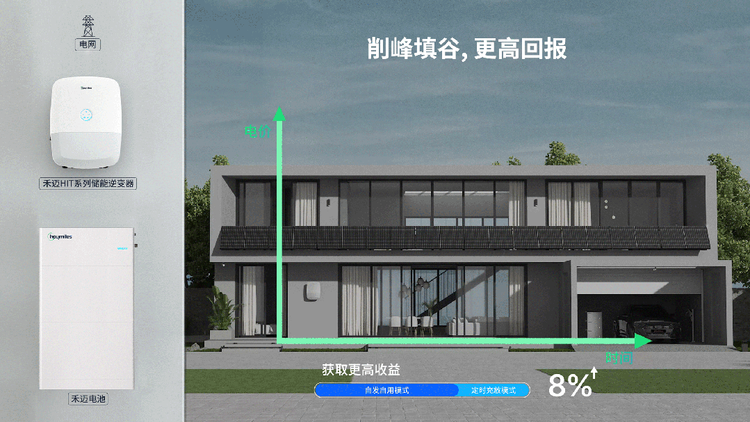 HIT系列分時模式較傳統(tǒng)自用模式可提升8%以上的發(fā)電收益,通過智能調(diào)度發(fā)電與用電時段,精準匹配當?shù)仉妰r峰谷差異,在實現(xiàn)收益最大化的同時,大幅降低用電成本,使能源自給率達到行業(yè)領先水平。